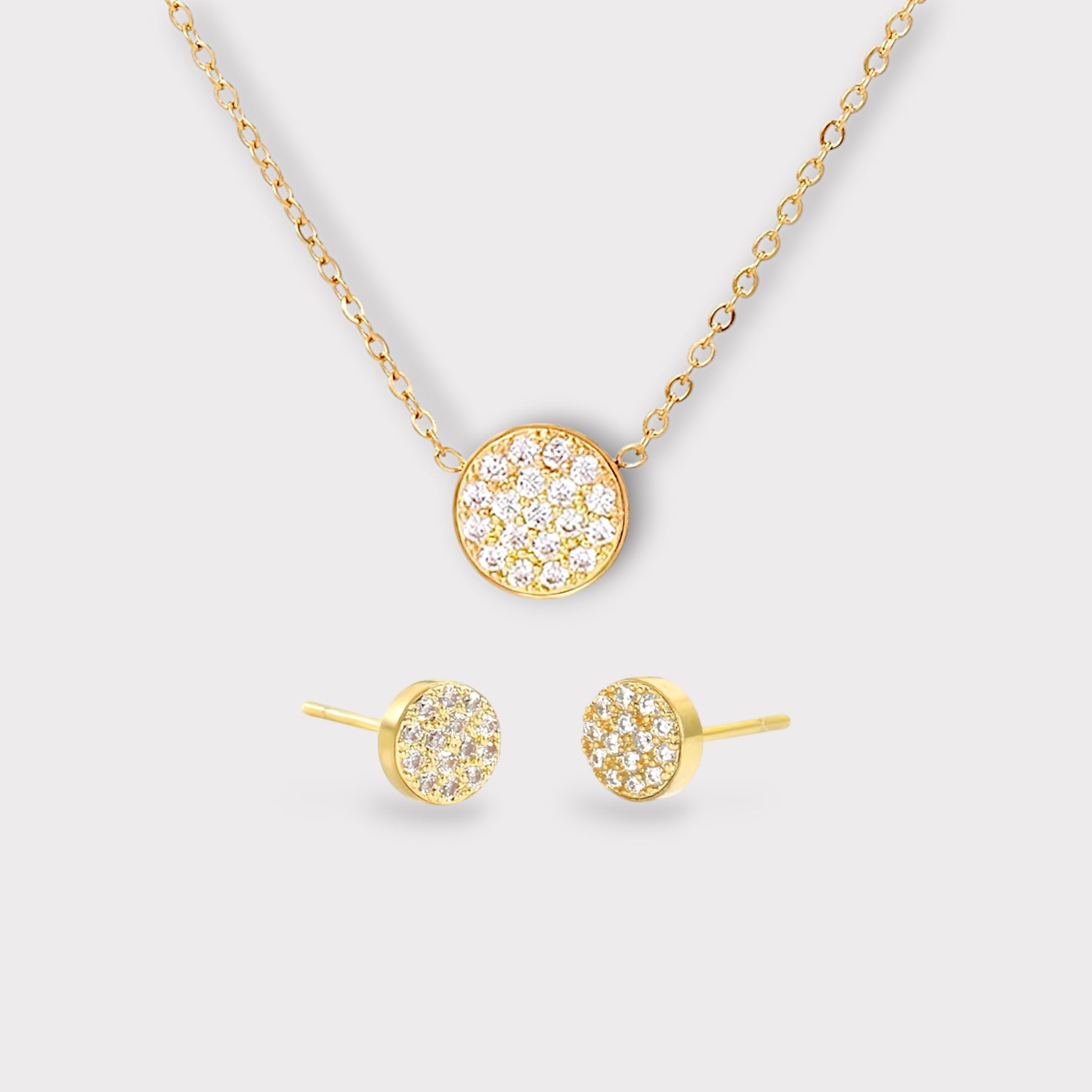Ice-abelle features a dainty, iced out circle pendant necklace on a delicate cable chain with matching stud earrings. Add a pop of sparkle to your outfit, wear her solo or embrace her as a layered piece. Either way, she's beautiful.